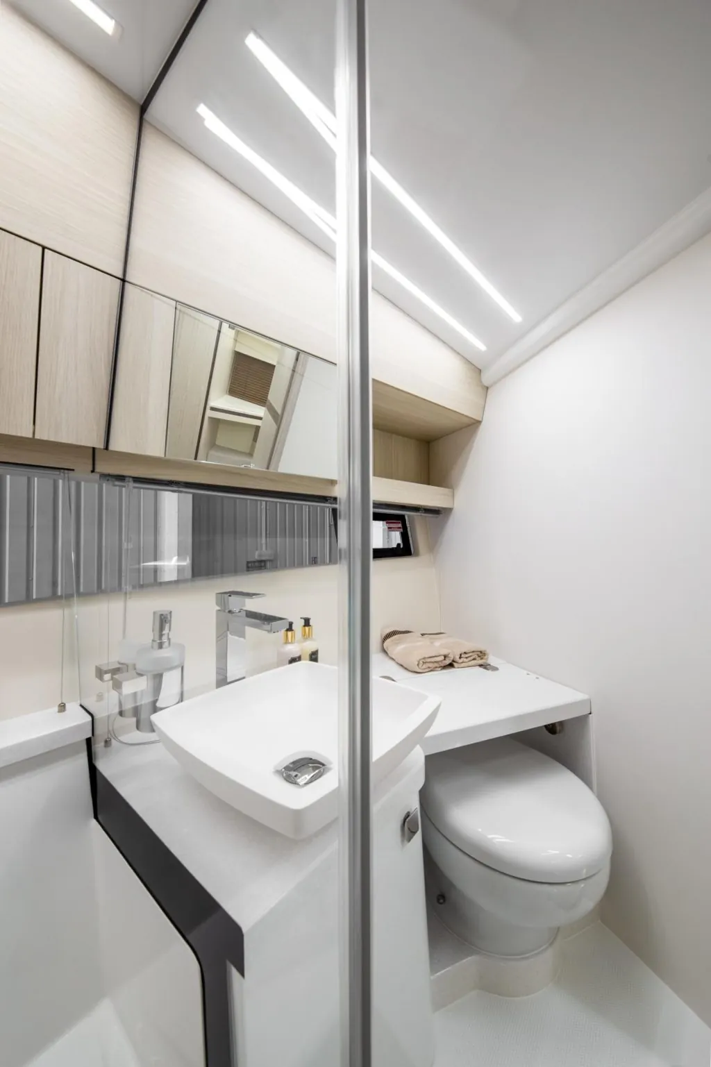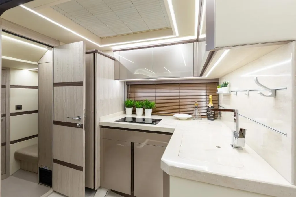 Below deck, the yacht surprises with its spacious and bright interior. Two comfortable cabins, a fully equipped galley, and a refined saloon area offer everything needed for weekend cruises or extended getaways. High-quality finishes, clever storage, and an ergonomic layout reflect Galeon’s focus on both aesthetics and functionality.