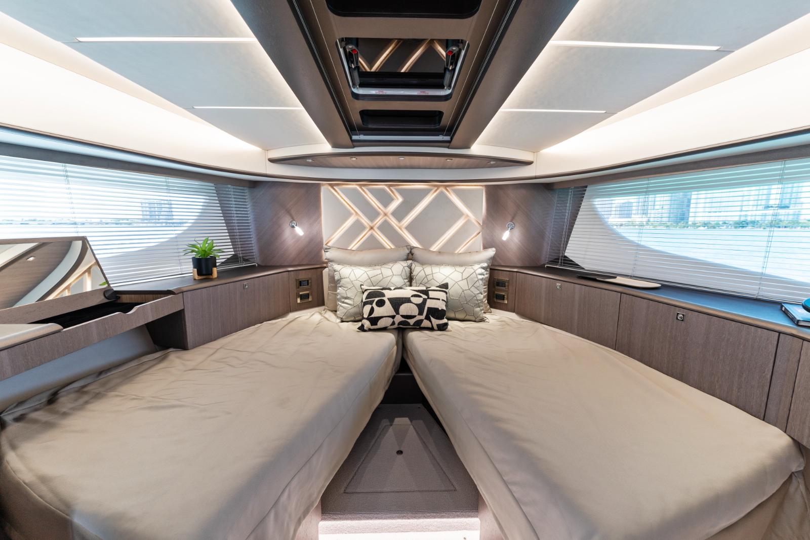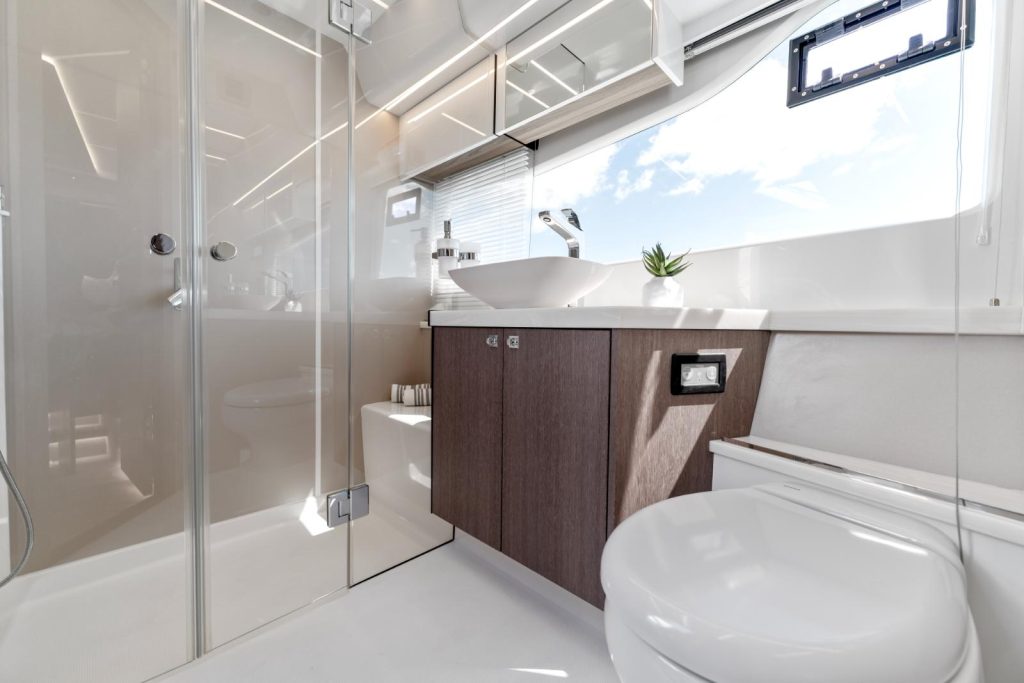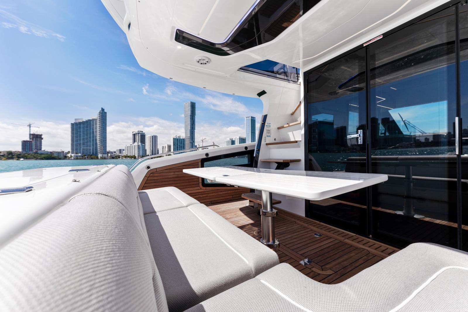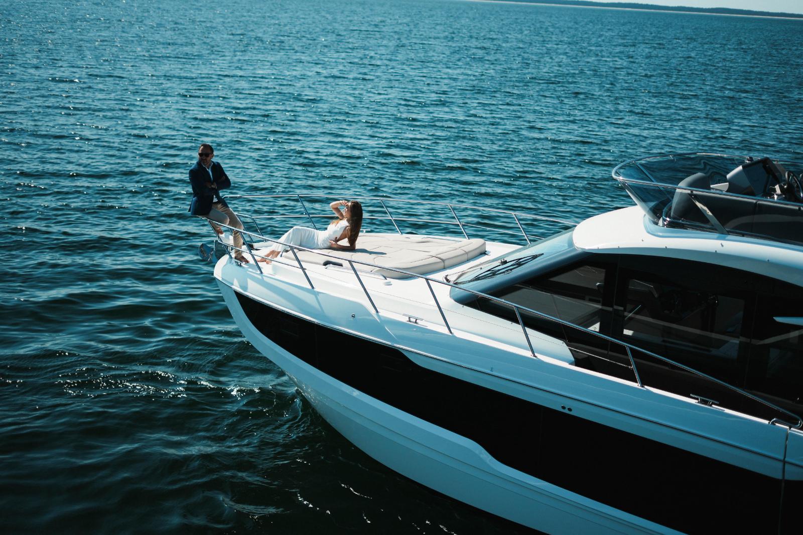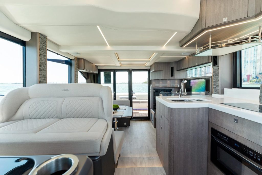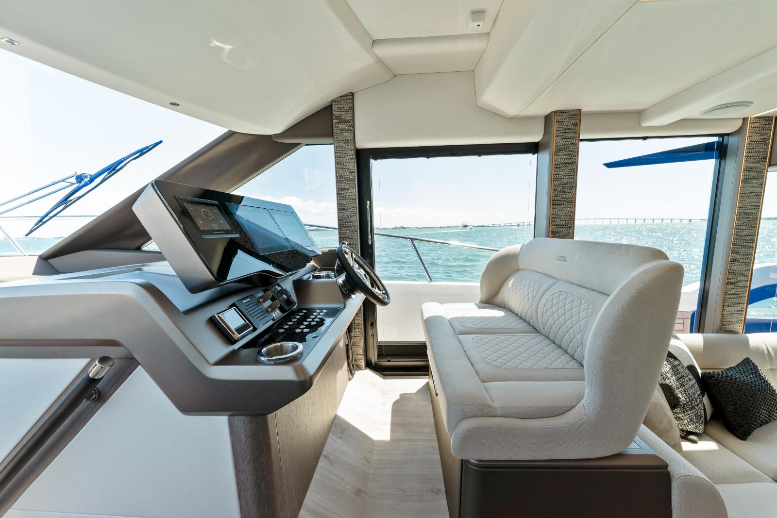 A dynamic silhouette combines with sporty accents throughout to create a boat that looks like it is moving even when it is standing still. As for exterior and interior living spaces, practicality and versatility were of utmost importance during the design phase of this model. The Galeon 440 FLY can be configured for either two or three cabin layout and comes available with a variety of luxury finishes and a comprehensive list of additional features that allow for maximum customization.