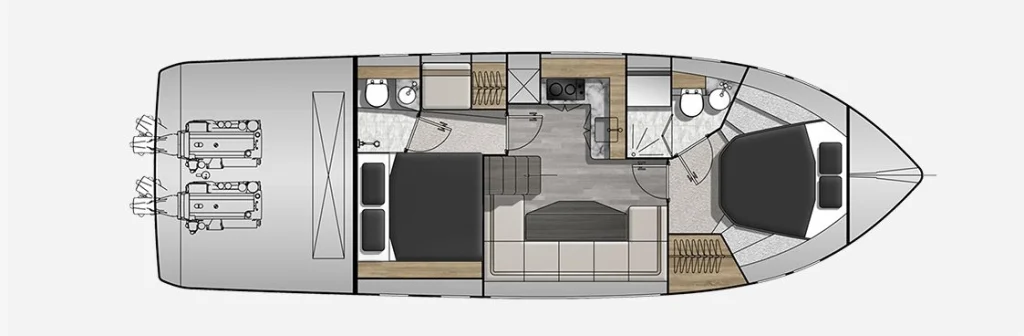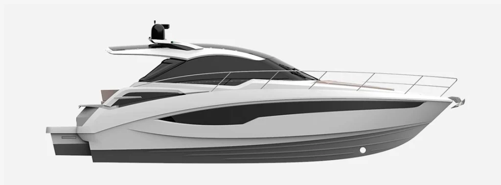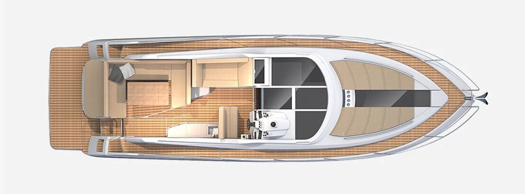 Su elegante silueta con hardtop, perfil bajo y amplias superficies acristaladas crean una presencia imponente tanto en la marina como en navegación. El techo corredizo de la cabina y las ventanas laterales abatibles permiten una ventilación natural y una conexión fluida con el entorno, mientras que la distribución convertible del cockpit invita al descanso, la convivencia o el asoleo, según el momento.