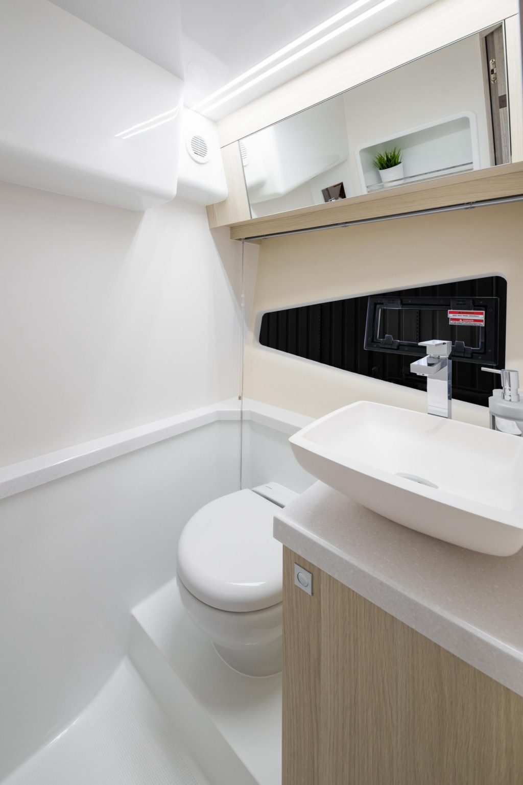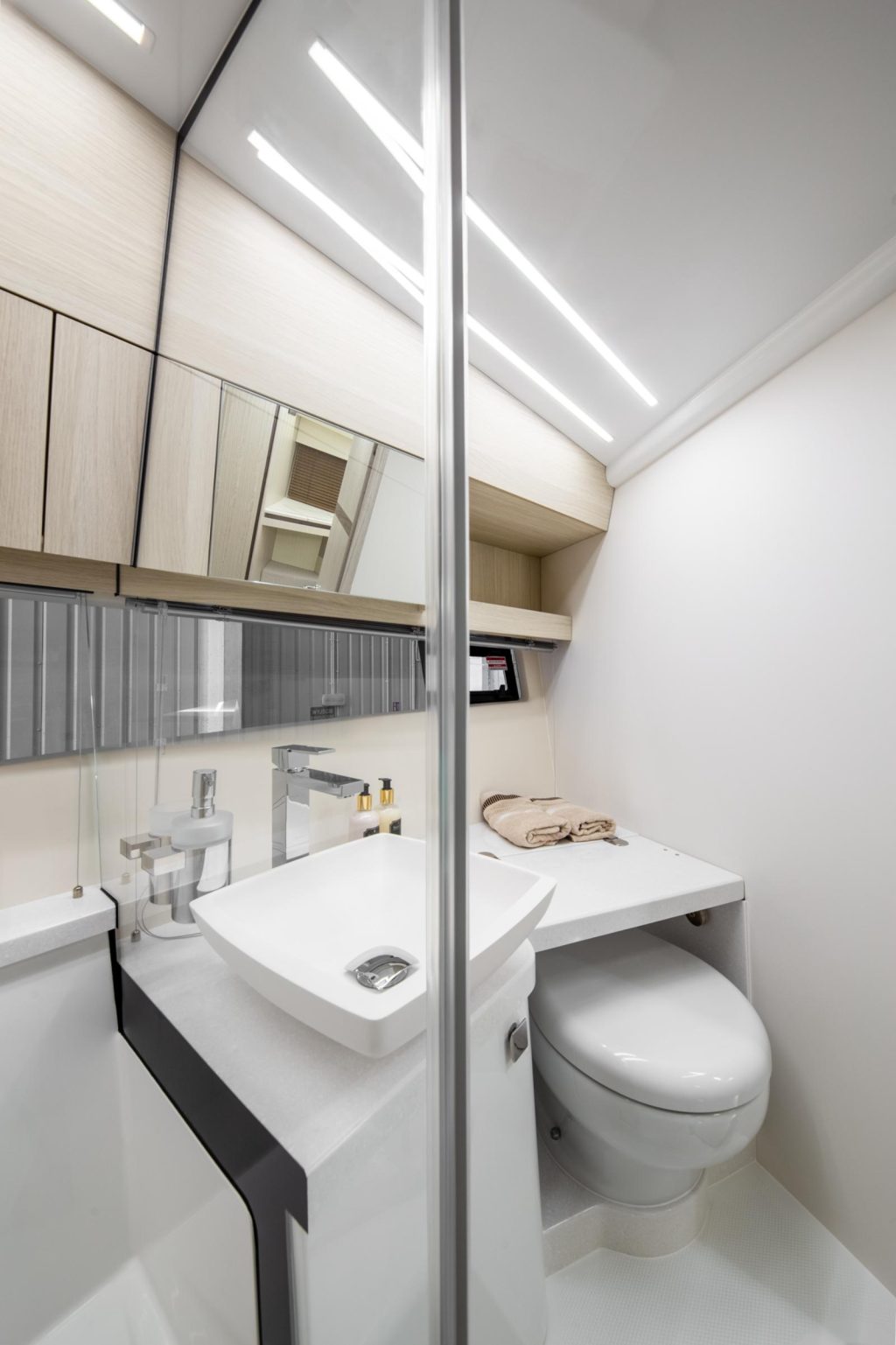 Bajo cubierta, sorprende con un interior luminoso y espacioso. Dos cómodas cabinas, una cocina totalmente equipada y un refinado salón ofrecen todo lo necesario para escapadas de fin de semana o travesías más largas. Acabados de alta calidad, almacenamiento inteligente y una distribución ergonómica reflejan el enfoque de Galeon en la estética y la funcionalidad.