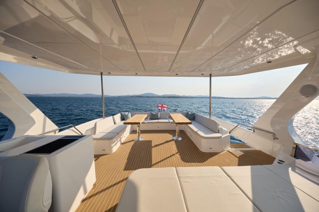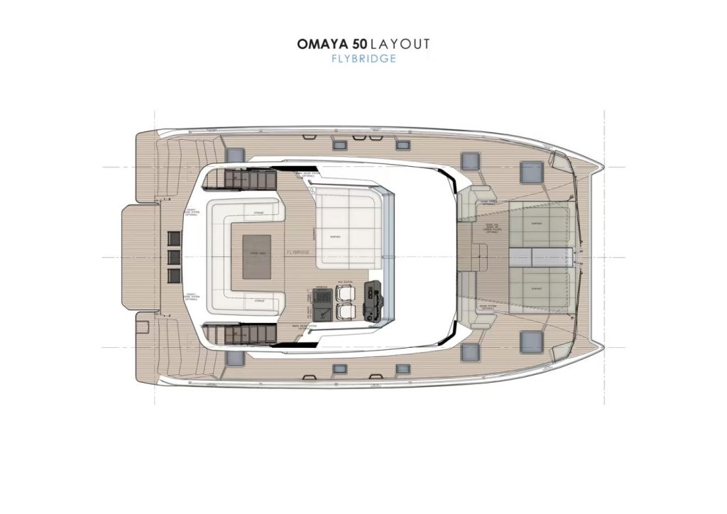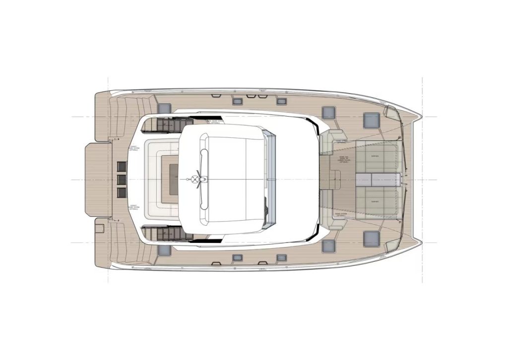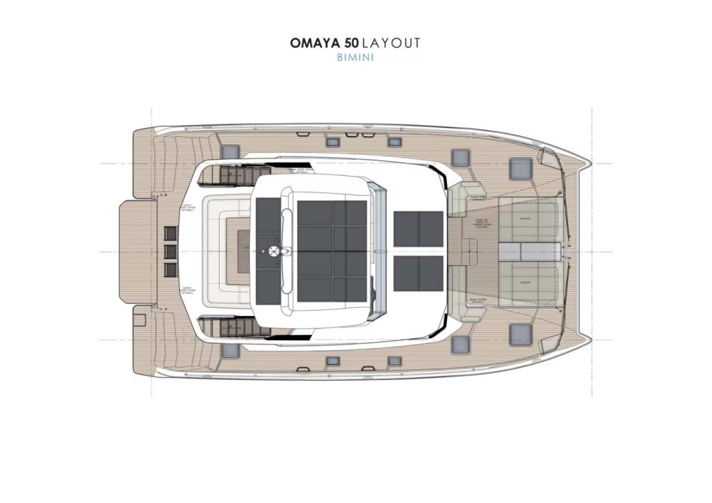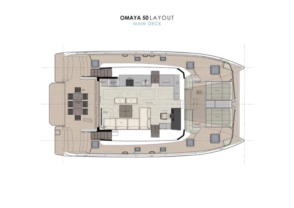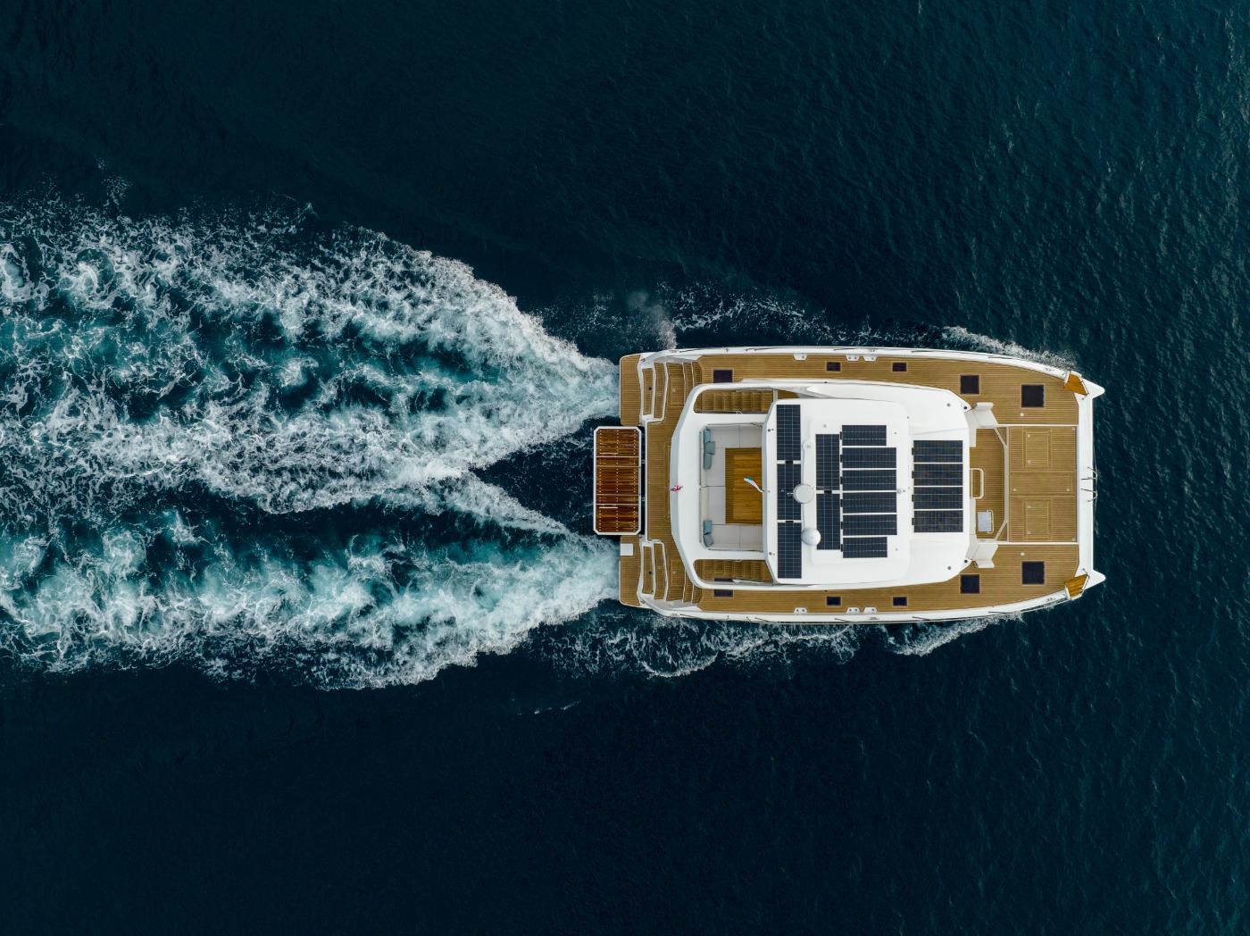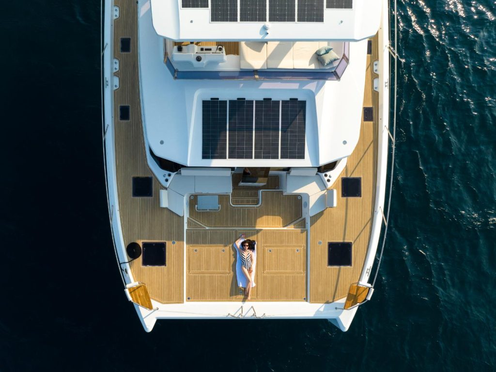 Un espacio social elevado diseñado para recibir hasta 12 invitados, equipado con paneles solares que permiten una vida tranquila y ecológica al navegar.
